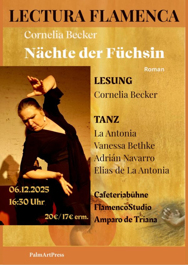 Unsere Autorin Cornelia Becker liest aus Ihrem Roman „Nächte der Füchsin“. Die gelesenen Passagen wechseln ab mit Flamenco Tanz. La Antonia und ihre Gruppe entführen die Zuschauer*innen mit Tanz nach Granada und erzählen die Geschichte mit der Stimme des Flamencos.